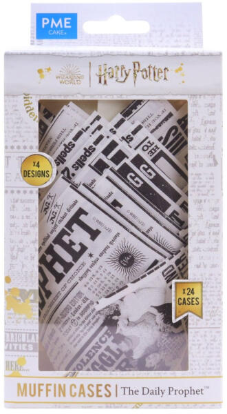 Ezekben a PME Harry Potter muffin formákban a varázsvilág varázslatos napilapja, a Daily Prophet újság szerepel. A csomag 24 muffinformát tartalmaz, amelyeken a Daily Prophet újság 4 különböző mintája látható. A muffinformák átmérője 10 cm/4". Kiváló minőségű zsírálló sütőpapírból készültek. Tökéletes muffinok, muffinok vagy édes és sós finomságok tárolására. Egyedi és inspiráló süteményes doboz, ideális bármilyen Harry Potter tematikus partira vagy egy különleges varázsló születésnapjára.